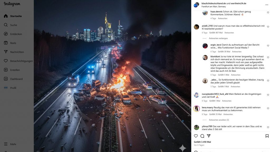 Folgende Bildschirmaufnahme habe ich auf Instagram gemacht. Das Titelbild funktioniert ideal als „Scroll-Stopper“, aber die Frage nach der verantwortungsvollen Nutzung von KI generierten Bildern (gerade in diesem Zusammenhang) muss sich der Kanal stellen. Das sehen auch die Nutzer so.