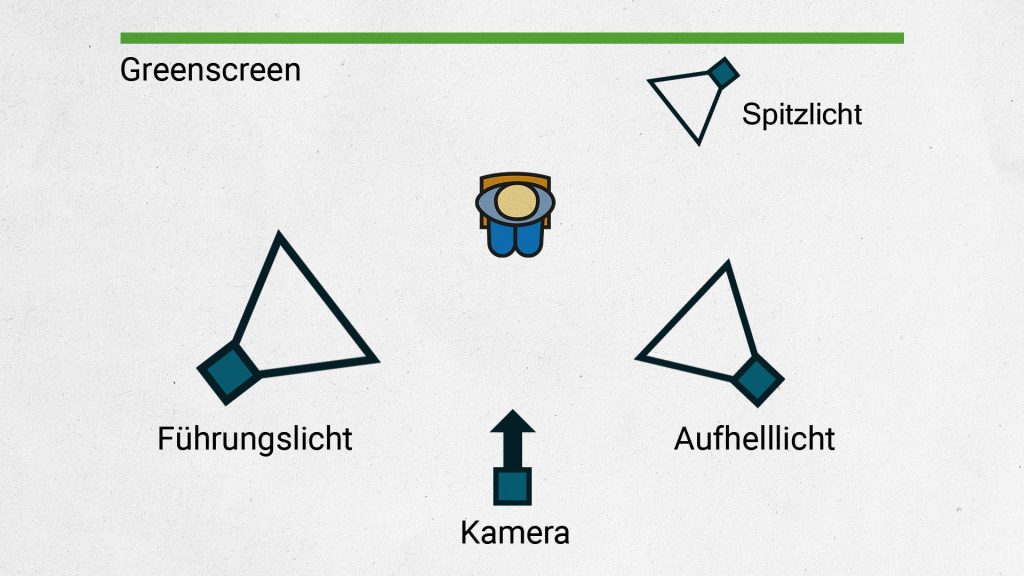 - Spitzlicht: Trennt die Person vom Hintergrund und verhindert grüne Lichtreflexionen.